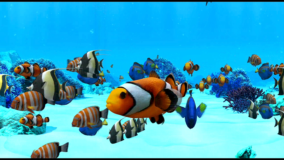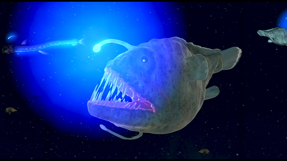 全編海の中の世界。サンゴとともに住む無数の熱帯魚から、深海にすむチョウチンアンコウや「龍宮の使い」など、普通では見られない希少魚類を目の前で体験できる、いわゆる水のない水族館です。