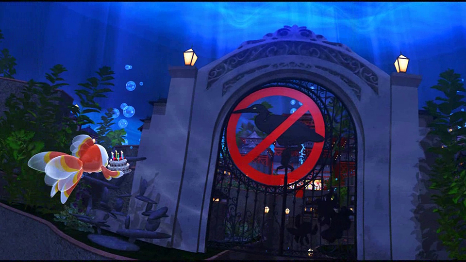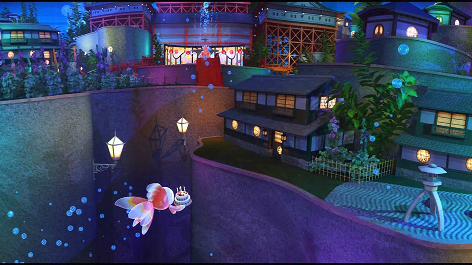 これは金魚のお姫様が暮らす、美しい金魚鉢の世界でのできごと。今日は待ちに待った金魚のお姫様の誕生日。年に一度の誕生日を祝おうと、金魚のお玉がお城に向かいます。お姫様がバースデーケーキの火を消そうとした瞬間、お姫様は大きなくしゃみをしてしまいまい、なんと囚われの身になってしまうのです。お玉はお姫様を助け出そうと七転八倒!ここぞとばかりに襲ってくる大敵黒鷺の攻撃をすり抜け、不思議空間をさ迷いながらも、けなげにお姫様を助けに向かいますが、さてその結末は・・・。